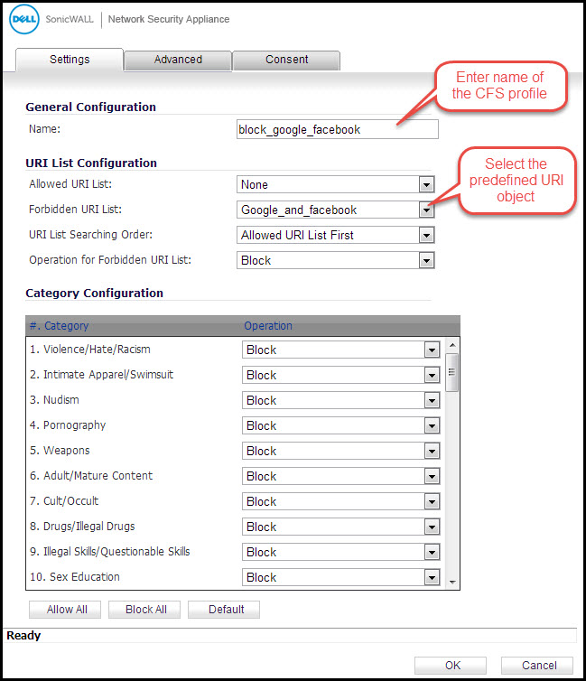 Dell Sonicwall 'da (SonicOS 6.2.5 ve üzeri işletim sistemi yüklü versiyonlarda) HTTP ve HTTPS (facebook.com, google.com) içerikli istenilen web sitelerinin nasıl bloklanacağını anlatacağım.