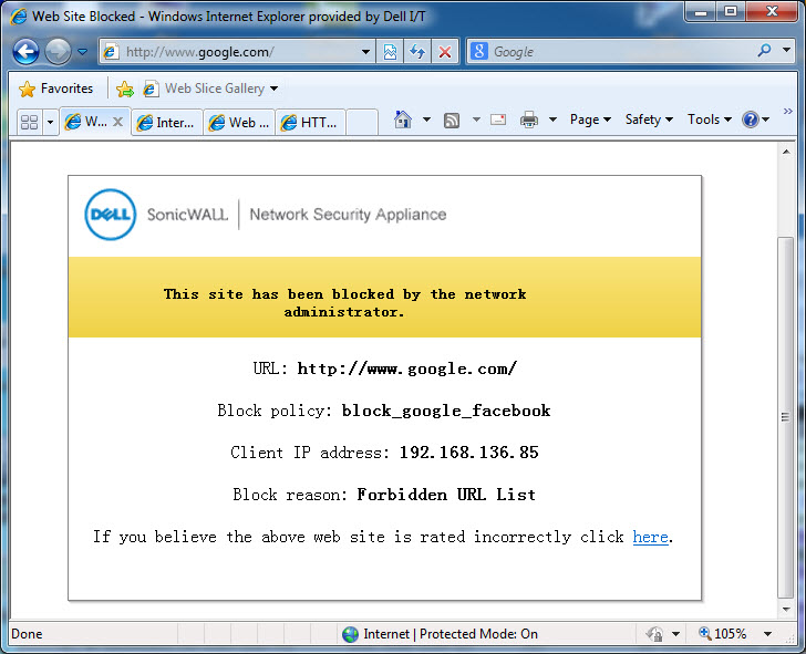 SonicWALL CFS(Content Filter System) tarafından bloklanmış sayfaları kullanıcılar açmak istediğinde görüntüleyemeceklerdir.